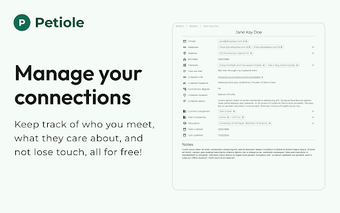 Petiole, LinkedIn bağlantılarınızı yönetmek için tasarlanmış bir özel iletişim yöneticisidir. Kullanıcıların bağlantılarını düzenlemesine, ilgi alanlarını takip etmesine ve ilişkilerini sürdürmesine yardımcı olur. Tamamen cihazda çalışan bu araç, kullanıcıların kişisel notlar eklemelerine ve bağlantılarını anlamalarına olanak tanır. Ayrıca, kullanıcıların geleneksel ağ kurma yöntemlerinden kaçınarak daha anlamlı ilişkiler geliştirmelerini sağlar.